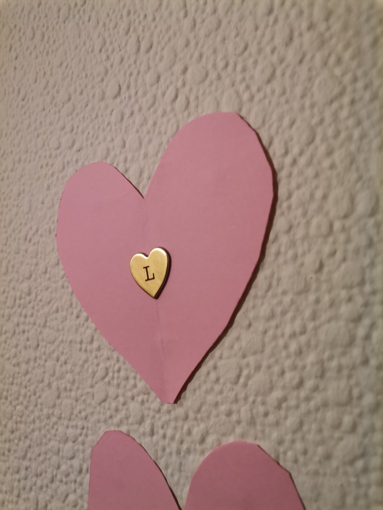 As you may see I simply cut out heart shapes, I have these heart shaped stickers with letters and I just stuck them on top of the pink heart. Then I used Blu Tack to stuck the hearts on the wall. I chose to make word LOVE, but it is up to you what you prefer.